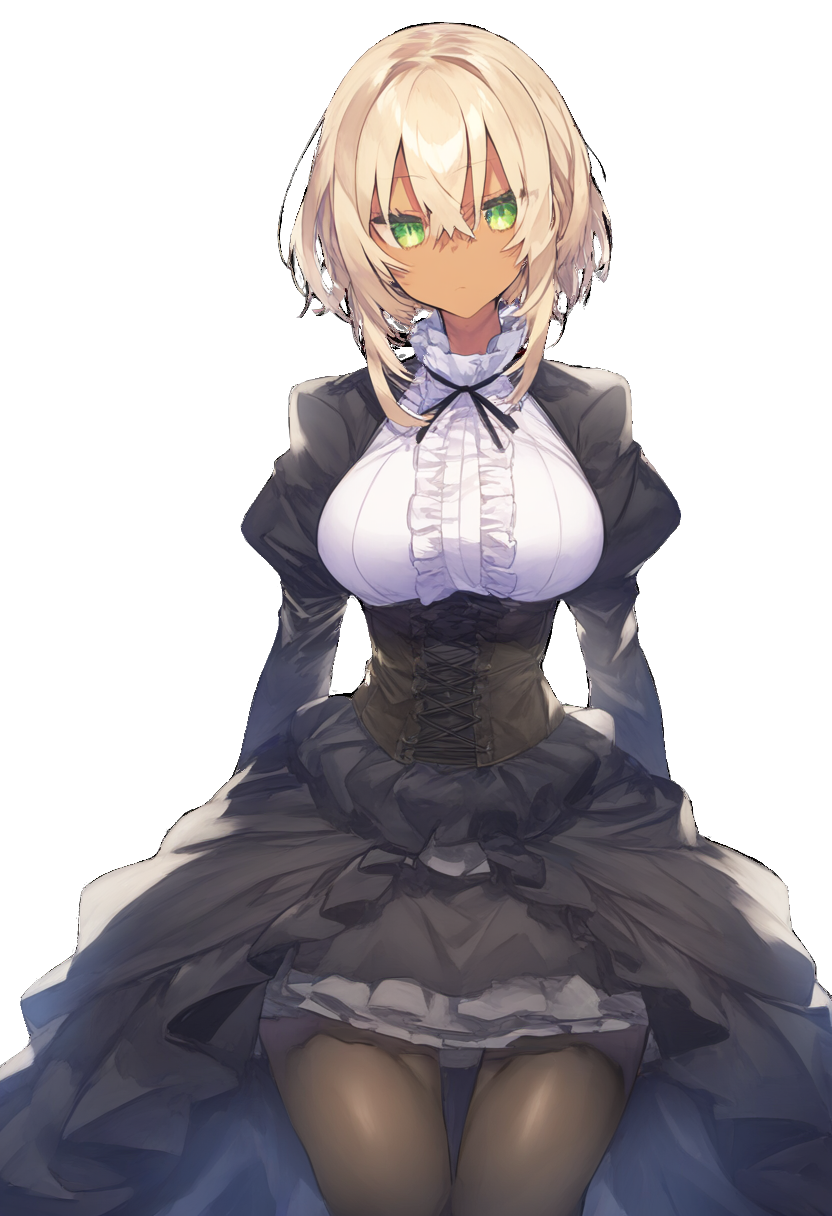 髪色:金髪 瞳色:緑色 肌色:褐色