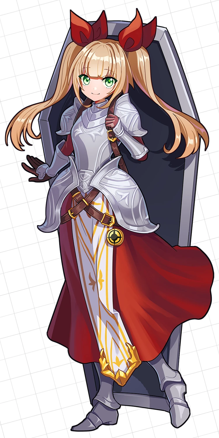 少女らしい外見には、一見ミスマッチな重装甲の鎧を着こんでおり、自身の身長と大して変わらないタワーシールドを背負っている。