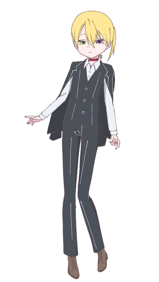 容姿:身長が150cm程度、黄色い髪に緑と紫の瞳、両耳耳介先端部分切断跡あり