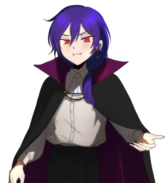 赤い目、鋭い牙、長い爪は全部自分で手入れしている。(カラコン、着け歯、ヤスリで磨いた爪)