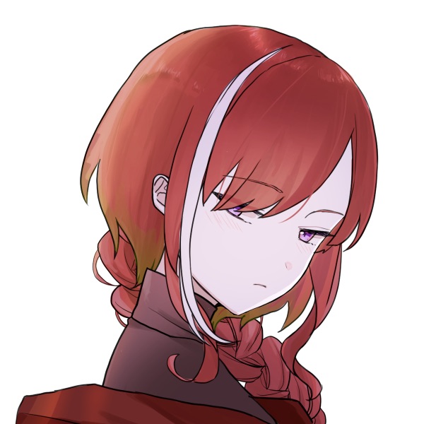 長い赤髪を三つ編みにしている。髪の一部が白いのは先述の事件の際の精神的ショックから。