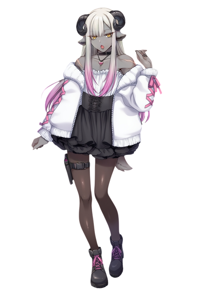 黒灰色の肌と二本の巻角、ふわふわの耳と尻尾