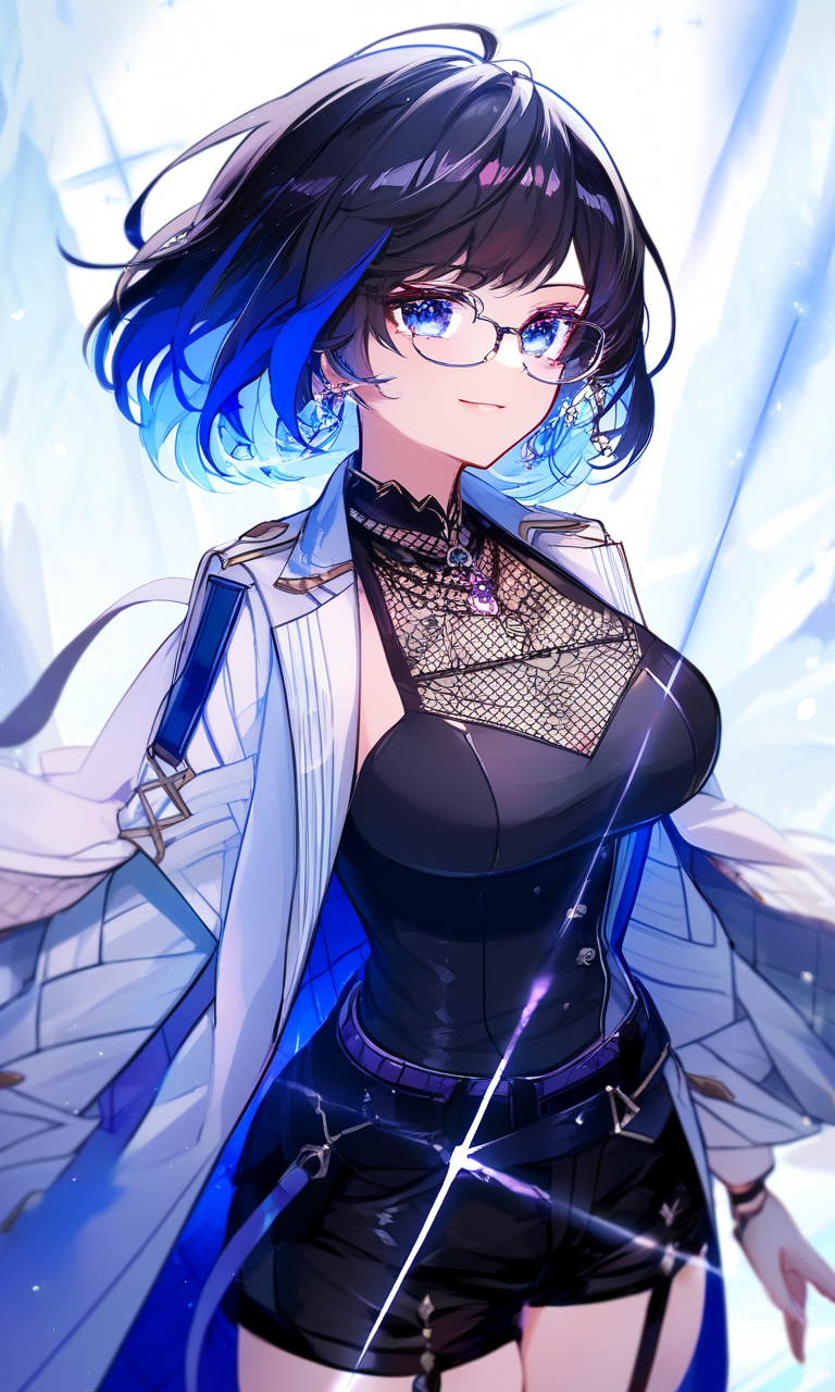 黒髪ショートヘアに水色のメッシュが入った美少女(25歳)。