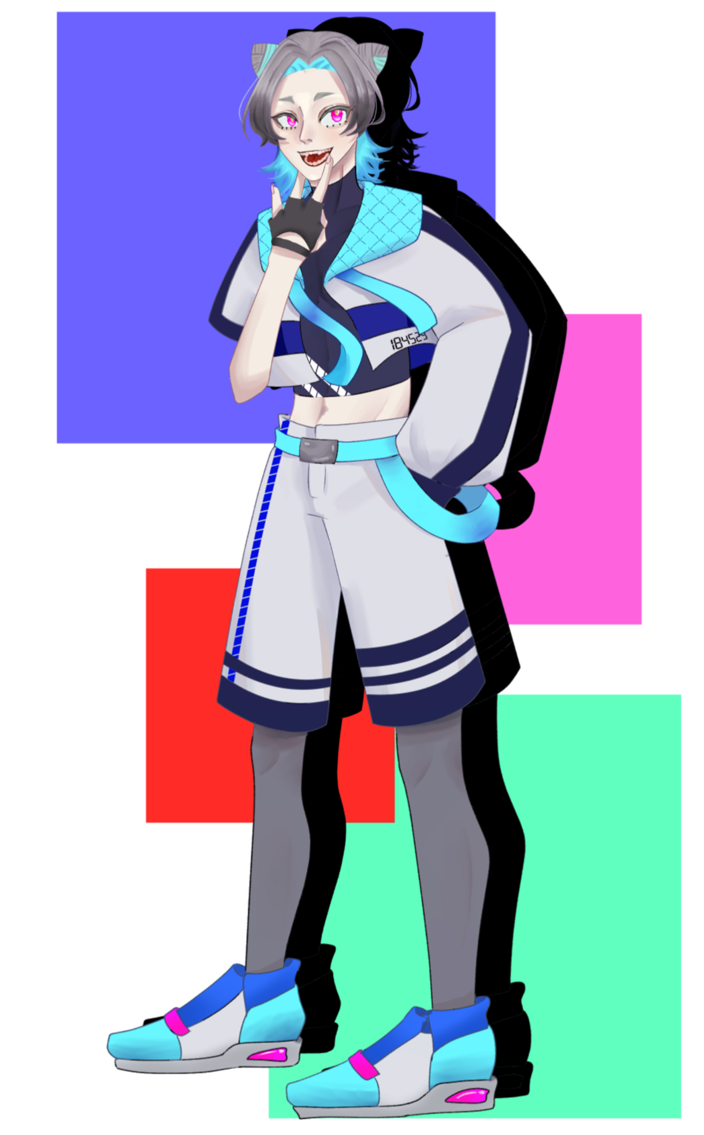 灰色から黒髪のグラデ蛍光ブルーから蛍光ピンクのグラデのインナーカラー