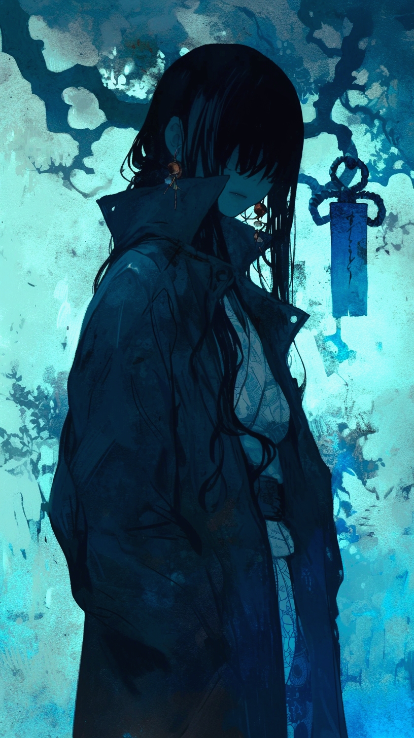 黒髪ロング。前髪で目を覆い隠し、隙間からおぞましい目が覗く。黒コートに藍色の和風アクセント。身長180cmのすらりとした体型で、神秘的で畏怖を感じさせる立ち姿。メリケンサック(ナックルダスター)を紐でネックレス状にまとめたものを首にかけている。