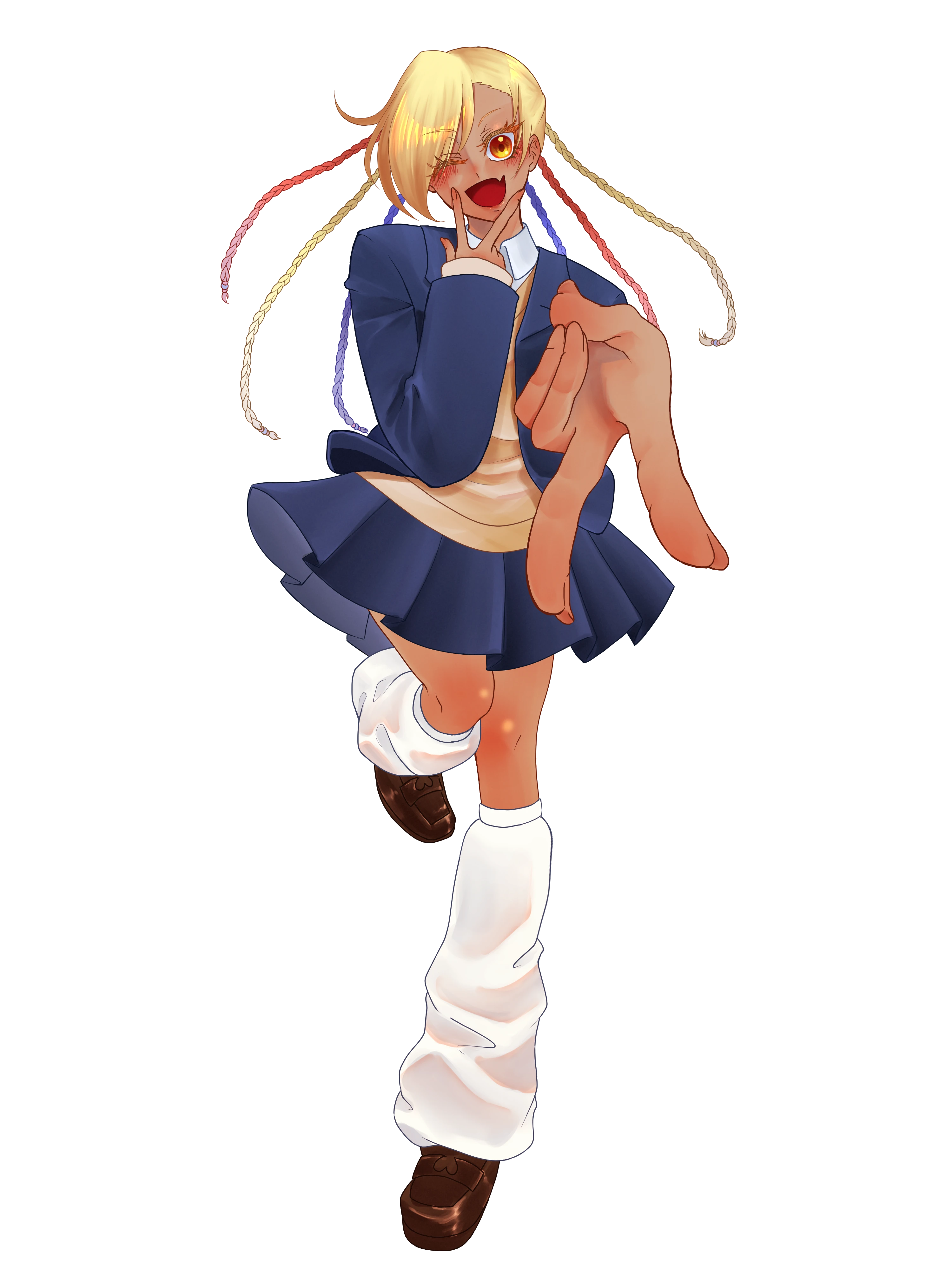 褐色の肌にハニーブロンドの髪、中性的な顔立ち。