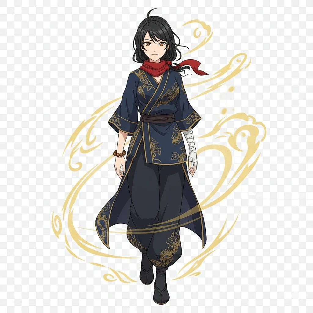 長髪を首元でまとめた和風美人。大陸風の動きやすいゆったりとした男性服を好んで身に着けている