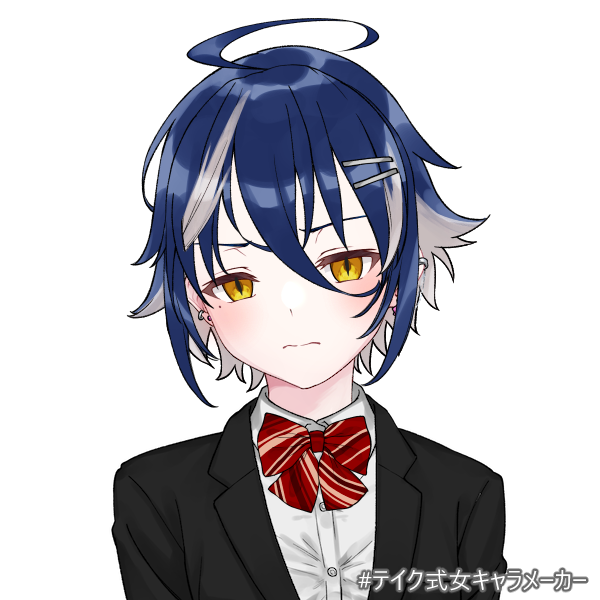 紺色の短髪が特徴的で、メッシュに銀色がかった髪色が美しいコントラストを作り出しています。彼女の瞳は琥珀色で、獣のような輝きを持っており、その視線はどこか神秘的で魅力的です。服装はシンプルでありながら、個性的なスタイルと色彩が彼女の個性を際立たせています。