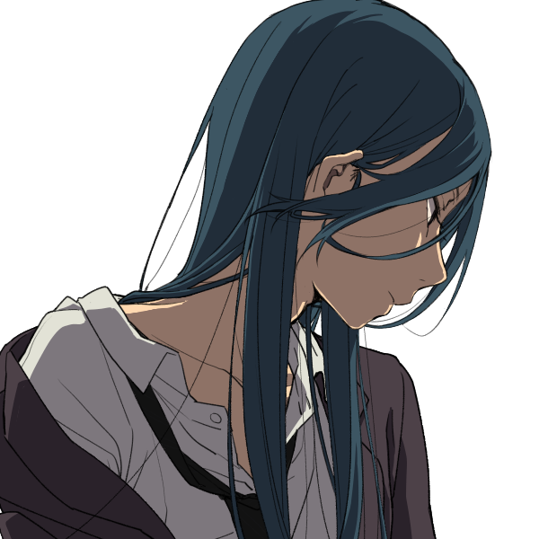 浅黒く焼けた肌と目力強めのつり目、ネイビーカラーのロングヘアが特徴的。