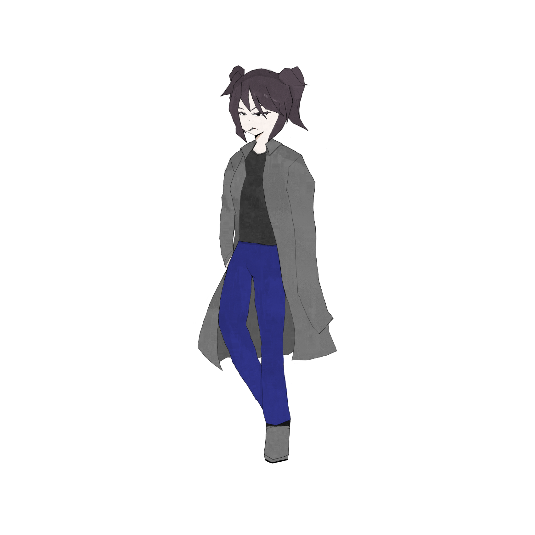 季節関係なくロングコートを羽織っており、下には薄手の黒いシャツ。そして、青のレギンスと灰色の靴を履いている。