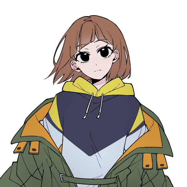 切りそろえた茶髪とぶかぶかのコートを羽織った女性。