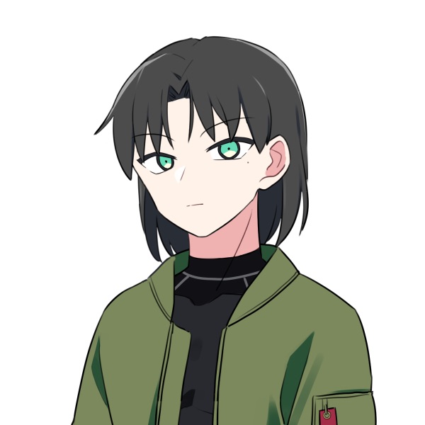 顎のあたりで切り揃えられた黒髪、三白眼気味のつり目、左目に泣きぼくろ、ブルゾン、動きやすさ重視の黒インナー