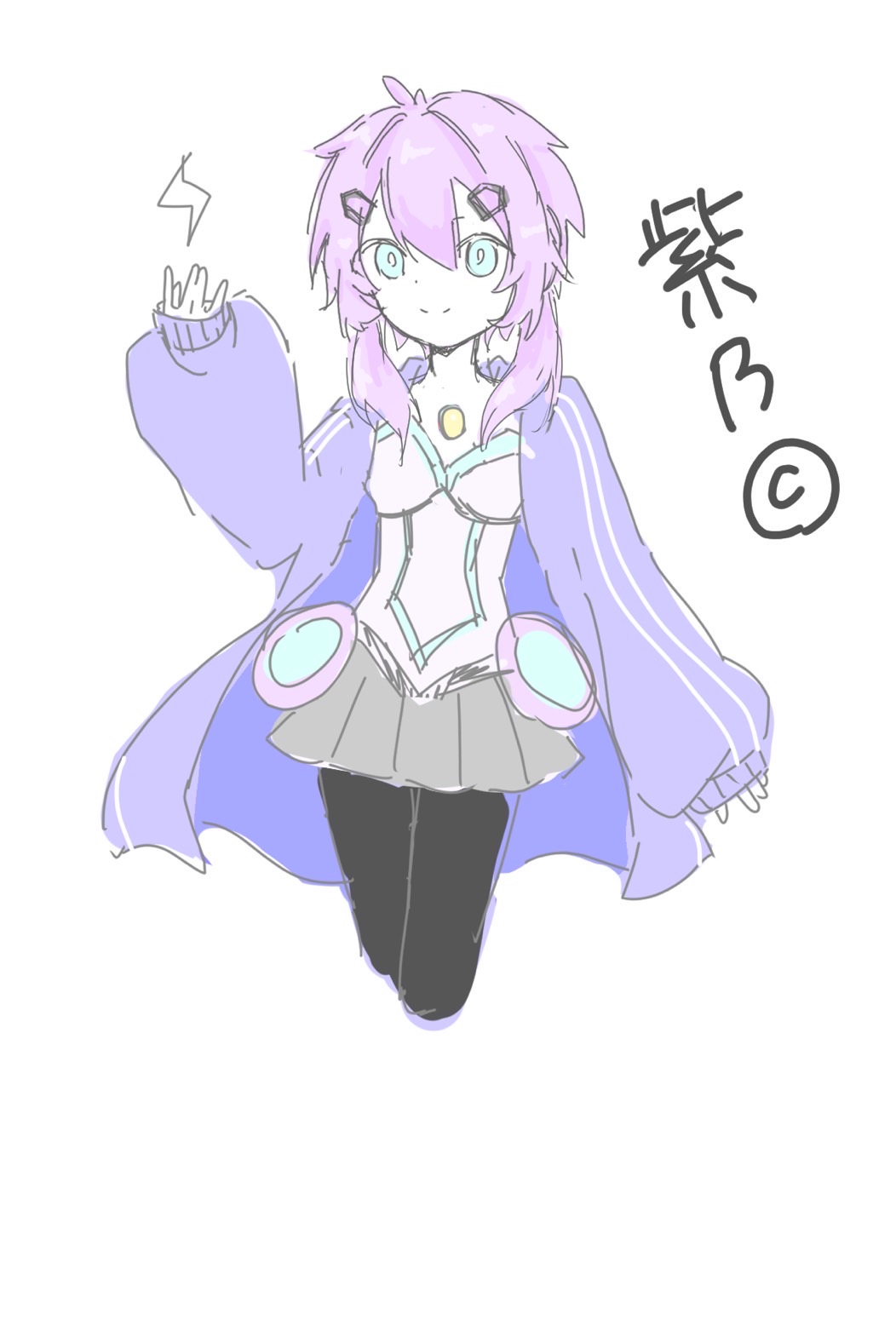 肩より少し長い紫色の髪を2つに結び、前髪はクリップでとめている。