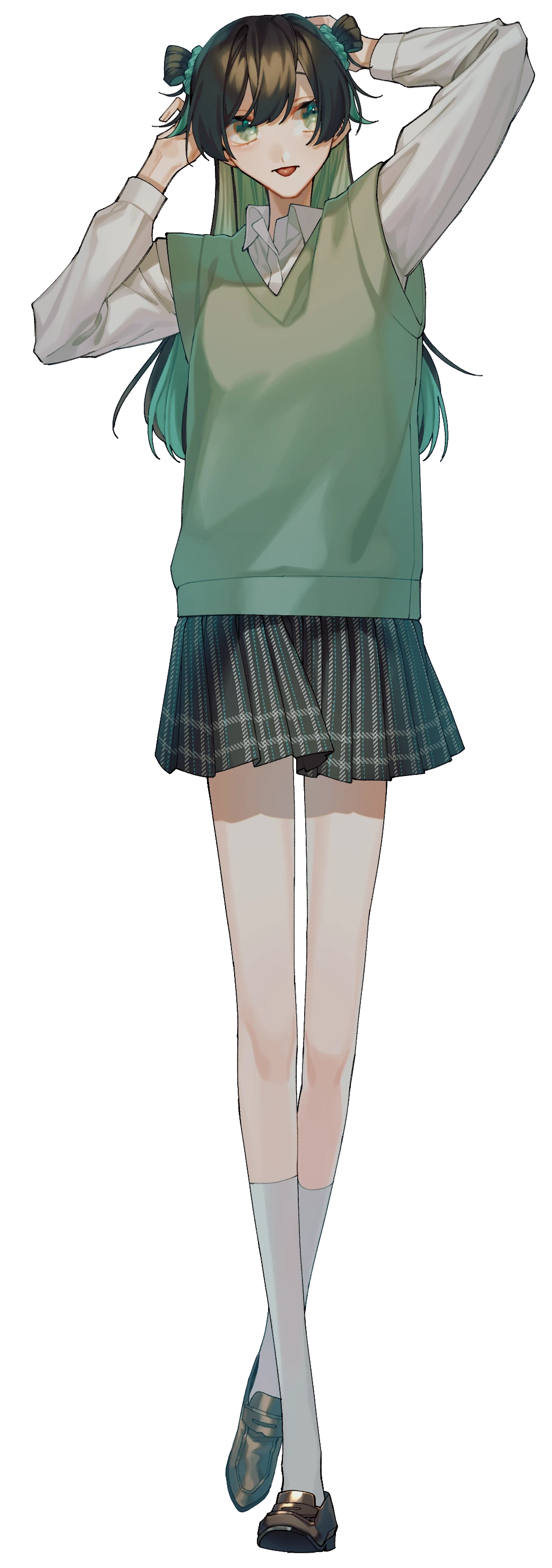 黒髪ロングに緑のインナーカラー。ちょっとお団子みたいにしている。かなり長身でスタイルがいい。眠い時の猫みたいな顔をしていることが多い。