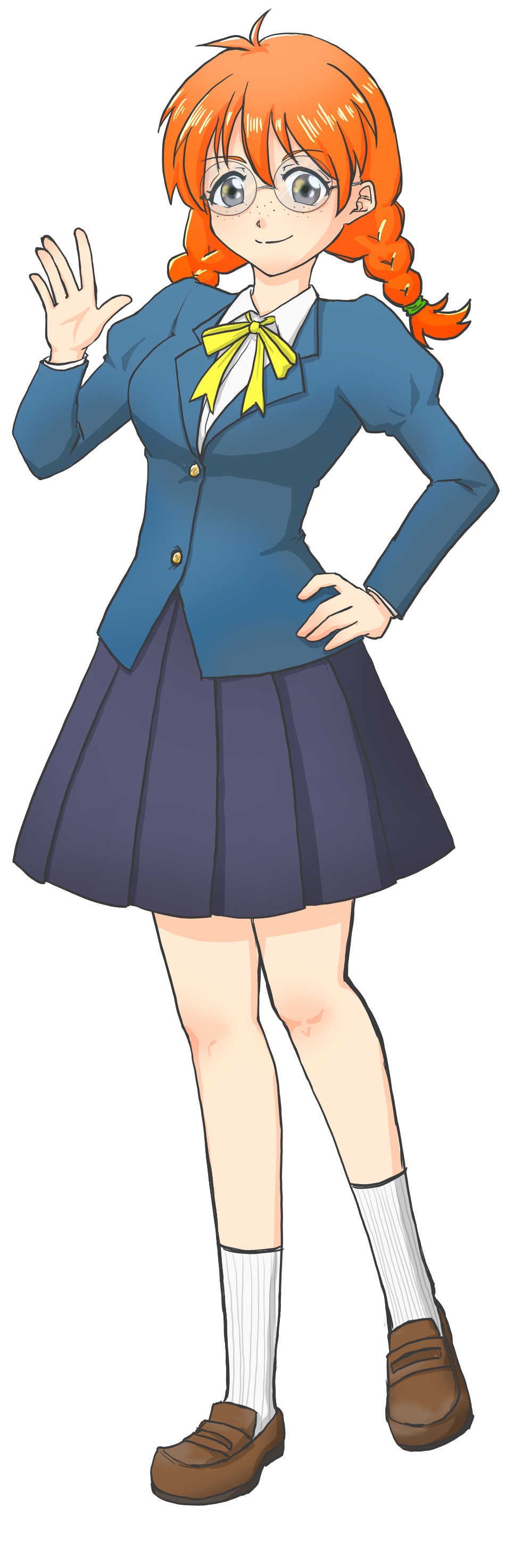髪は二つに分けた太い三つ編みおさげ。タレ目。そばかす。