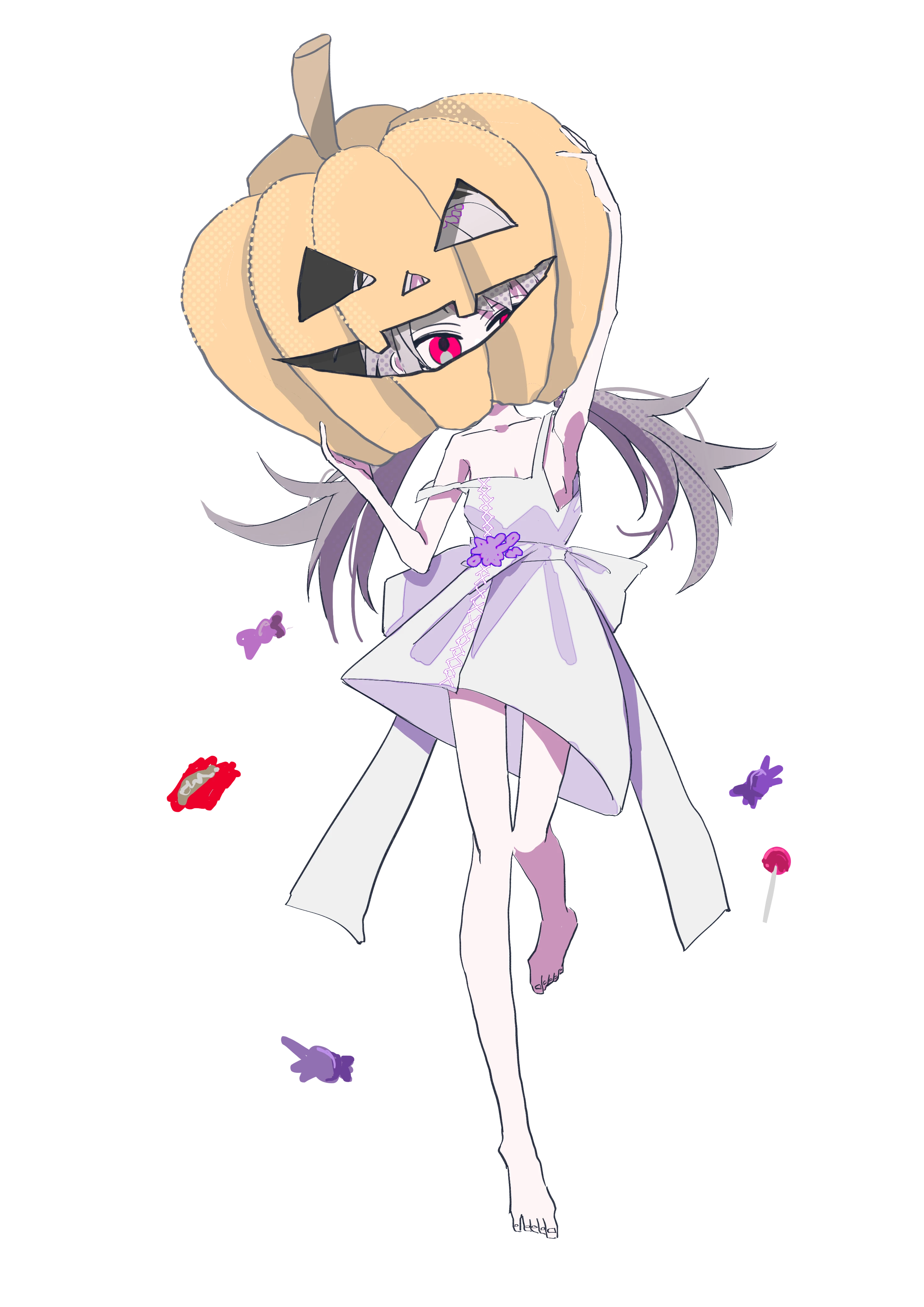 かぼちゃは外れない。何なら器は死人のままなので成長もせず姿はいつまでもこのまま。本人はそれの何がどうと感じる程成長していないので多分支障はない。ただかぼちゃが大きいし重いしで嫌になっている節はあるようだ。