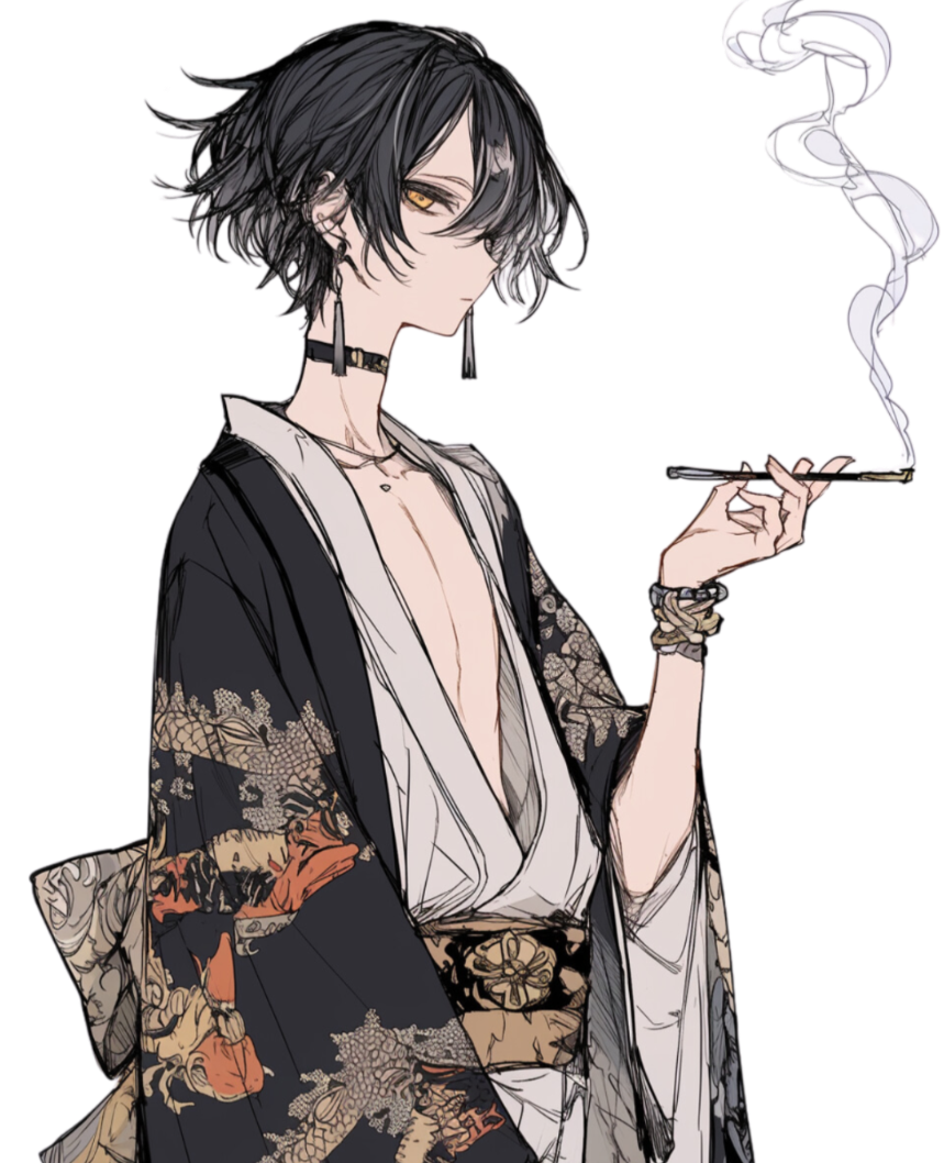 常に物憂げな表情を浮かべながら、片手に煙管を携えて紫煙を燻らせる得体の知れない人物。黒を基調とした風采に映える黄色い瞳が印象的。明るい場所では瞳孔が縦長に変化する。その見据えるような冷たい瞳からは、人間に対する猜疑心と好奇心の入り混じった複雑な心境が窺える。生粋の等価交換主義者で、相応の対価が無ければ頼まれても能動的に行動することは滅多にない。好奇心を刺激された場合は例外で、文句を垂れながら嬉々として行動する。また、遠い過去の記憶は殆ど覚えておらず、物事の優先順位や時間感覚が一般人とは異なる。