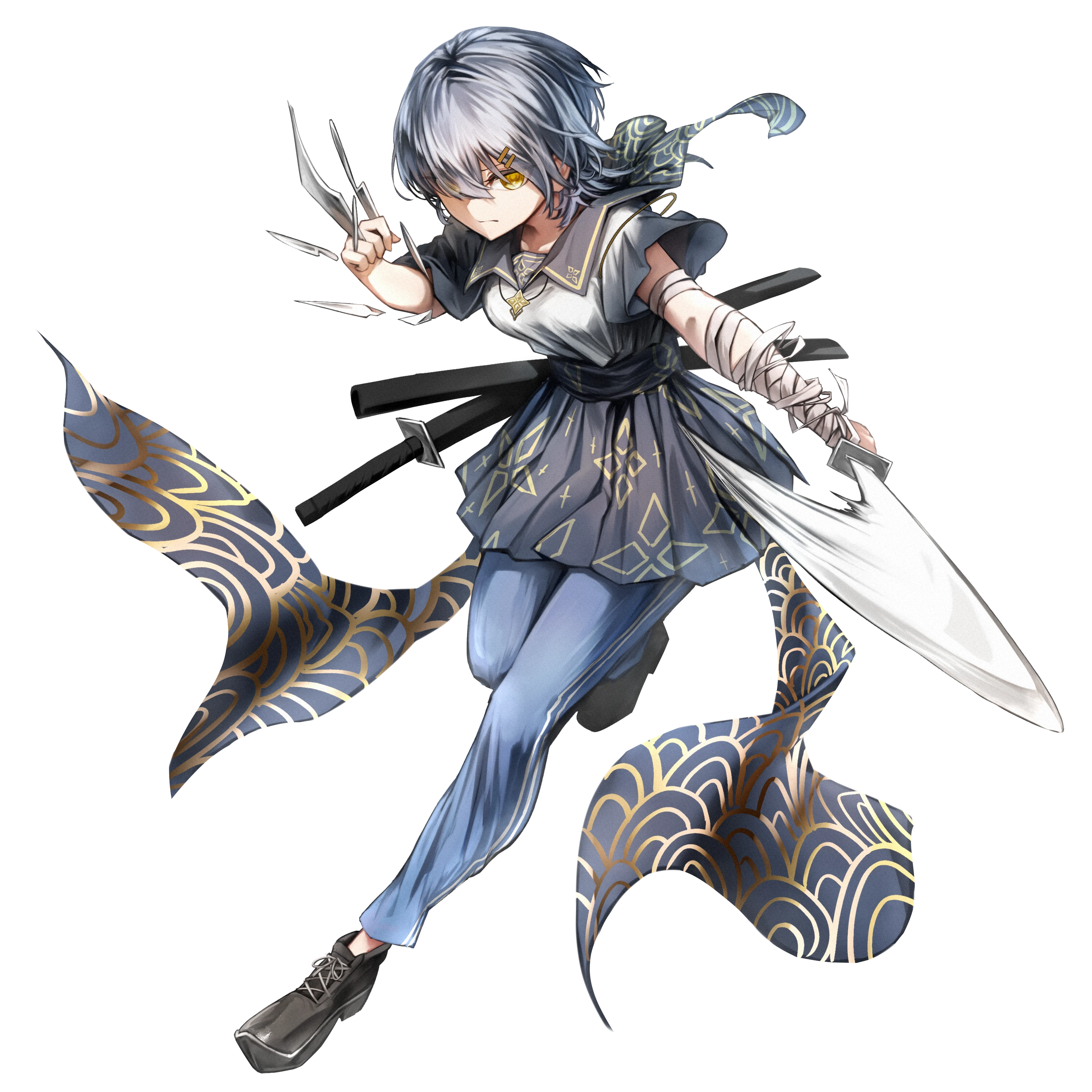 主に、日本刀二本と刃で近接戦闘を行う。
