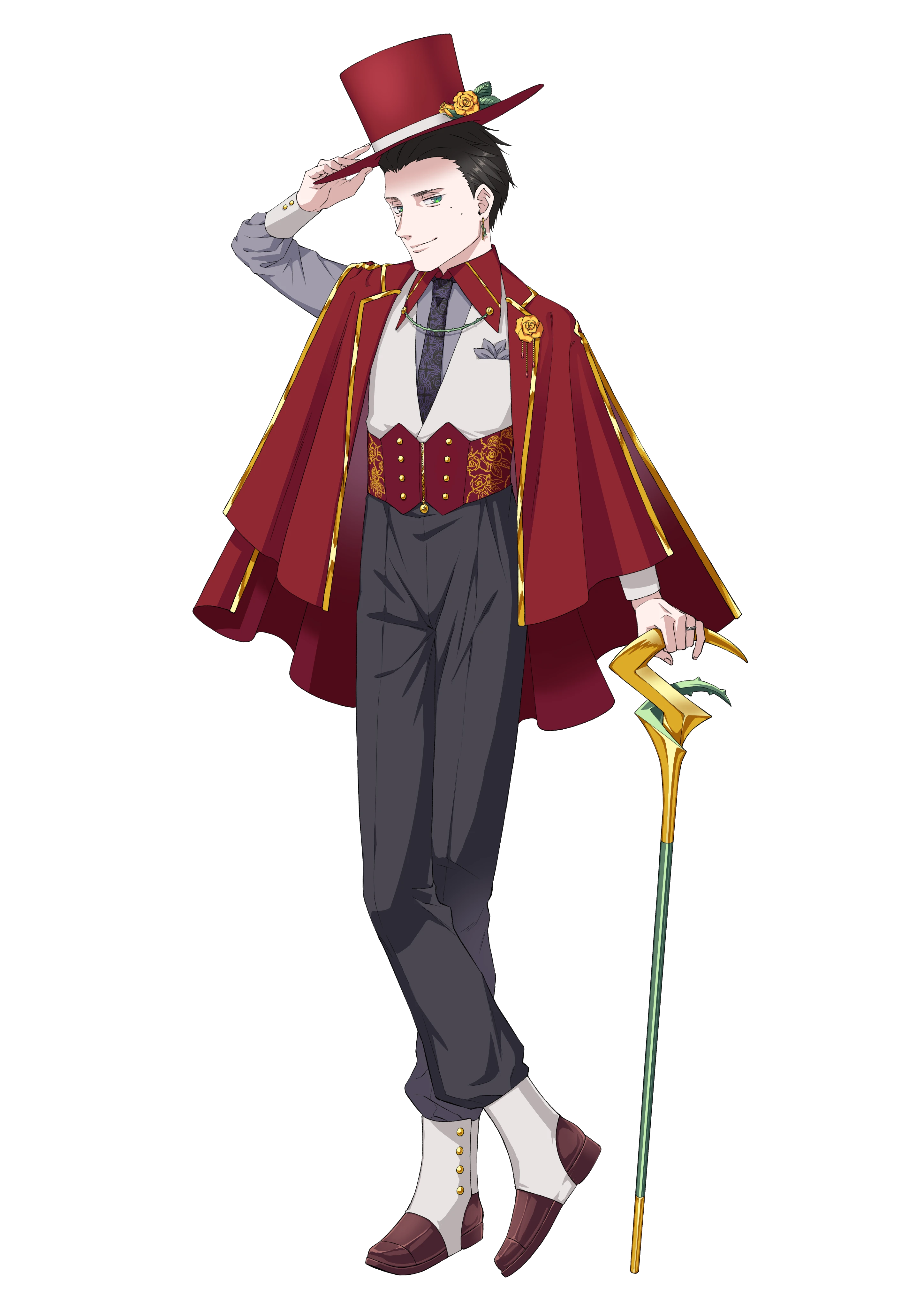 ・碧眼で黒髪の男性。髪は短くオールバックにしている。いつも深紅の衣装服を身に着けている。