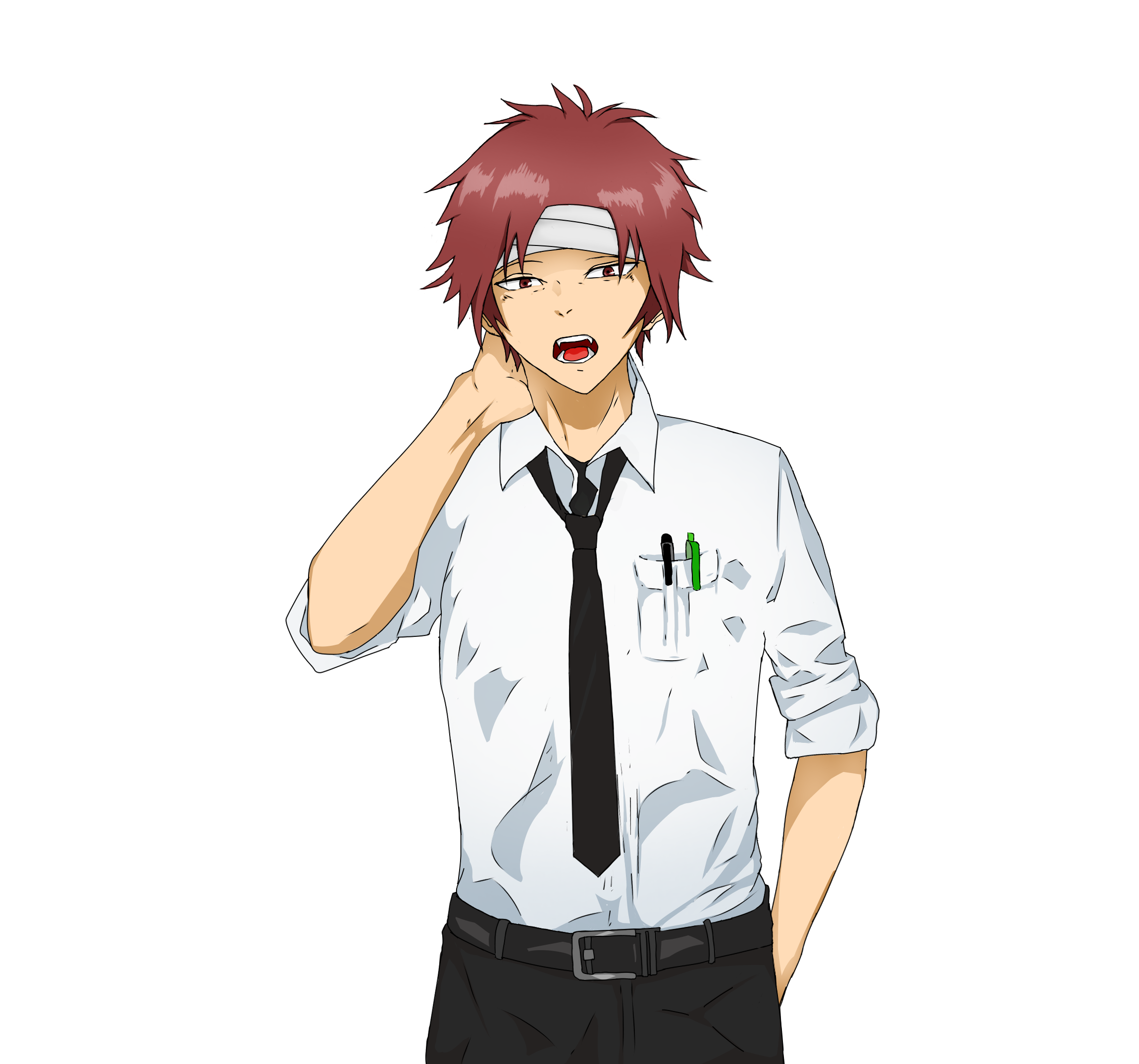 赤茶色髪、頭に包帯を巻いている。
