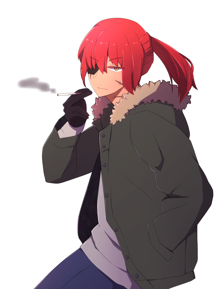 髪色は深紅。長い髪の毛を、乱雑に一つにまとめている。