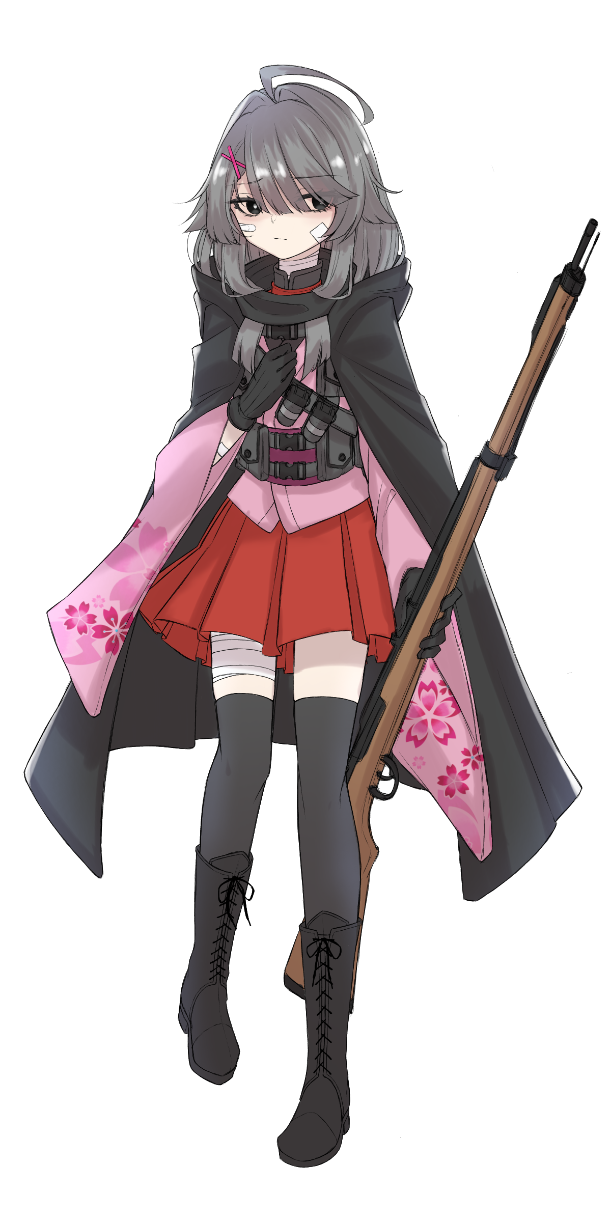 着物の上から弾倉やナイフ、手榴弾等の近代武装を装備し、スナイパー用の外套を羽織っているという風変わりな恰好をした少女。