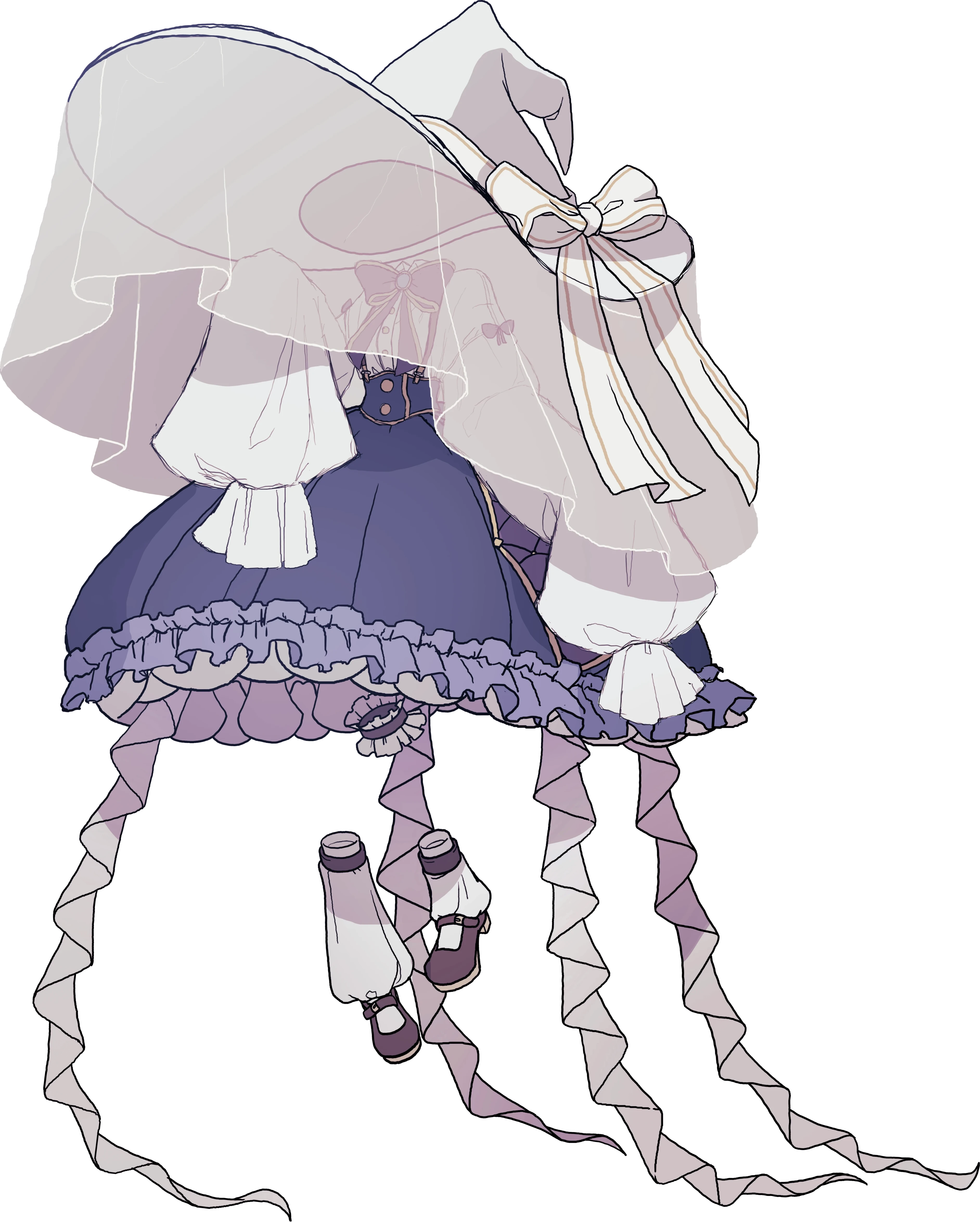 服装は白を基調とした体のシルエットが隠れるようなもので、魔女のような大きな帽子を着けている。