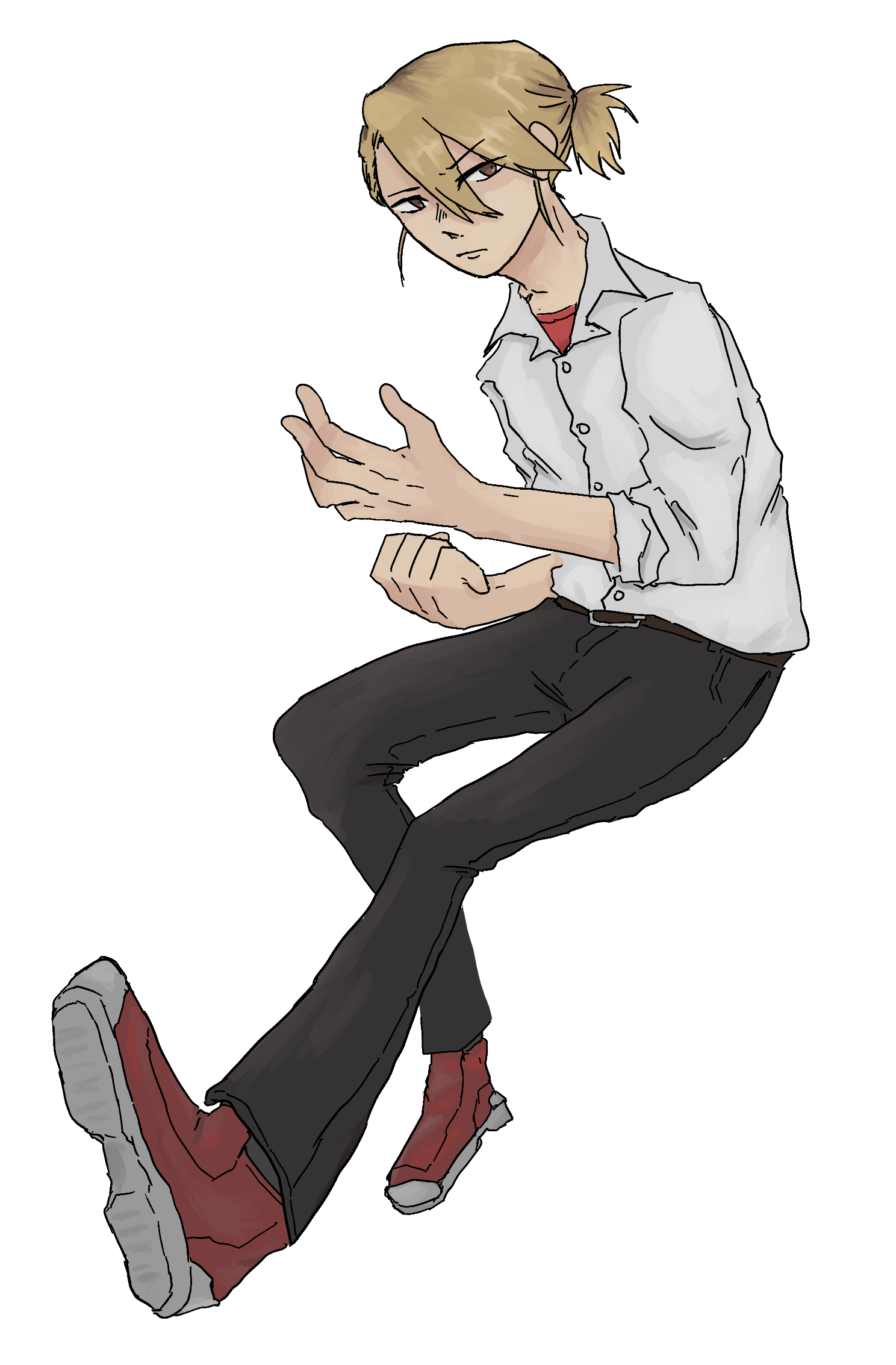 根元がプリン気味の金髪、高い位置で髪をまとめている。