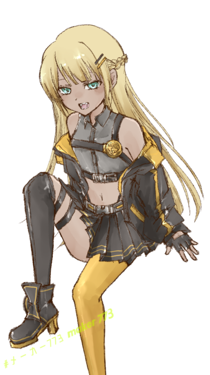 金髪碧眼、褐色系の肌をした少女。短いスカートの下にはスパッツを履いている。