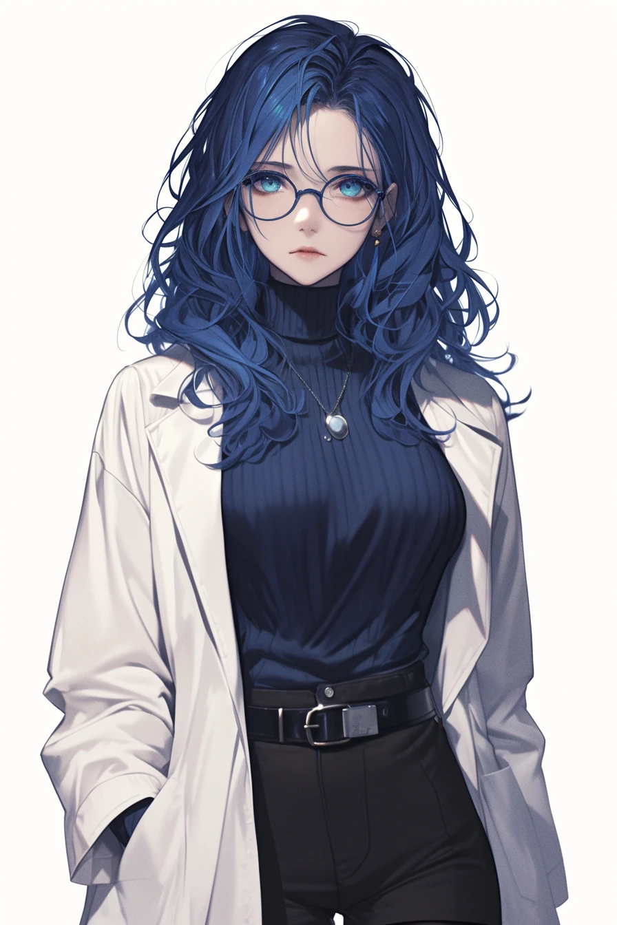 青髪、眼鏡、ウェーブの入った長髪
