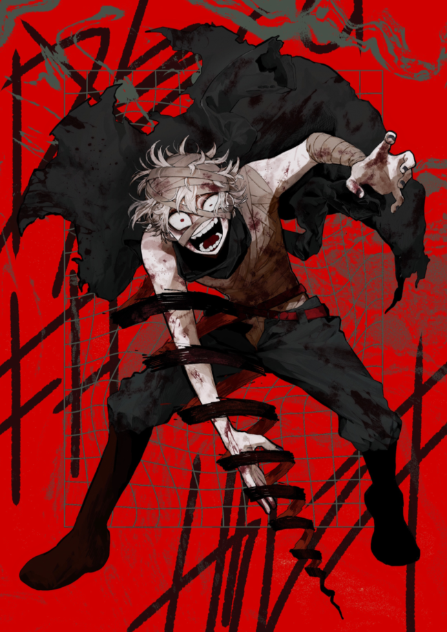 特徴:全体的に薄汚れている、包帯、血を能力で固めて作った靴、ボロボロの学ランをマントのように巻いている