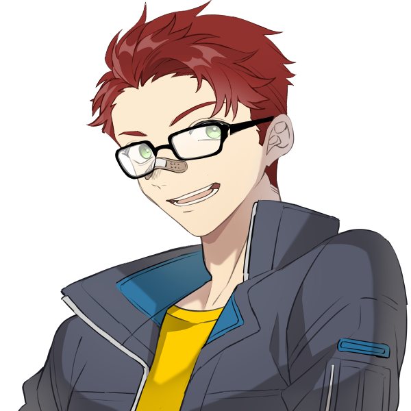 見た目:右腕にアームカバーをつけた赤髪にメガネの青年