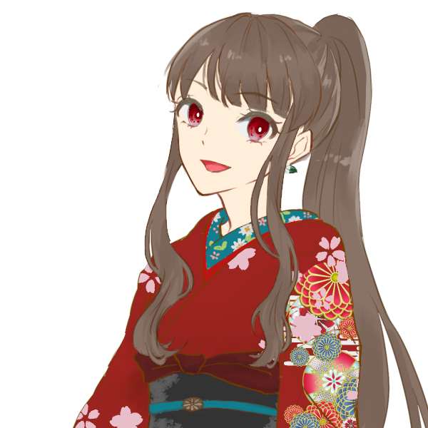 長い髪をポニーテールにした和服の女性。