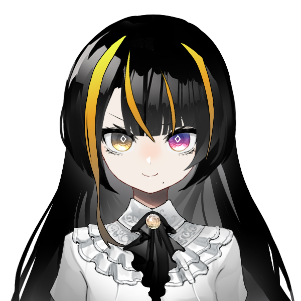 黒髪のロングヘア。黄色の前髪メッシュと黄色と紫のオッドアイ、口元にはホクロ。