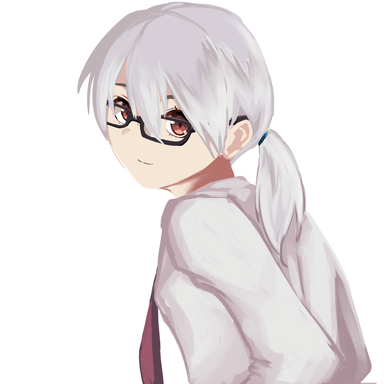 白髪赤目そばかす、黒の眼鏡、ワイシャツ。白のジャケットとパンツを着用