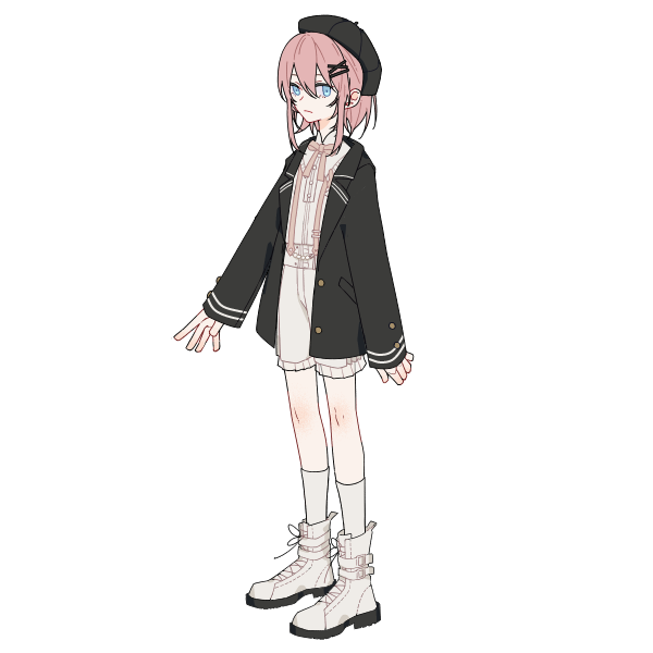 白のブーツで桃髪で黒色のヘアゴムをしている