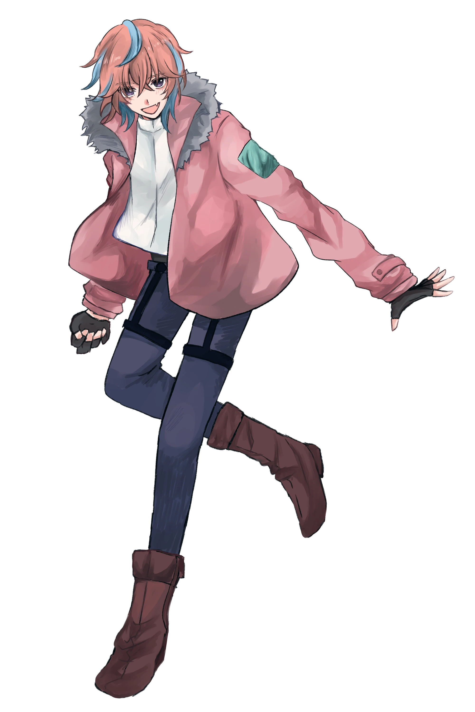 髪色:鴇色 ピンクメッシュ つり目 八重歯