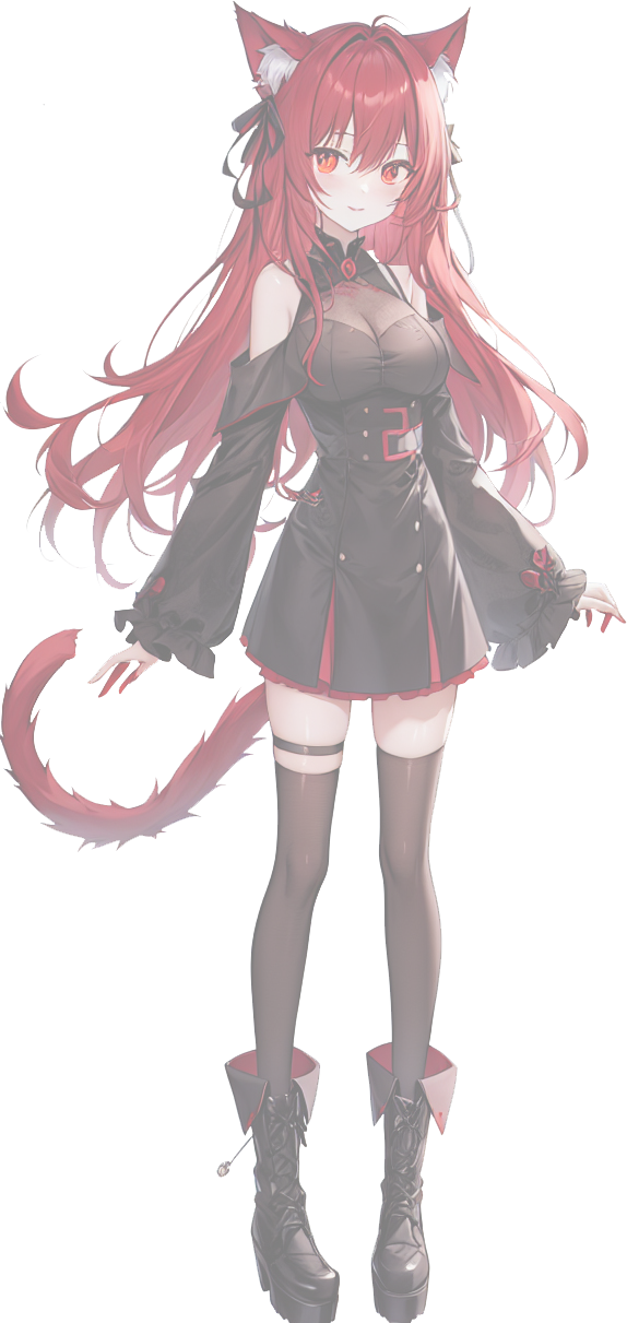 炎の様な赤髪と、同じ色をしたネコ科の物と思しき耳と尻尾が特徴的。