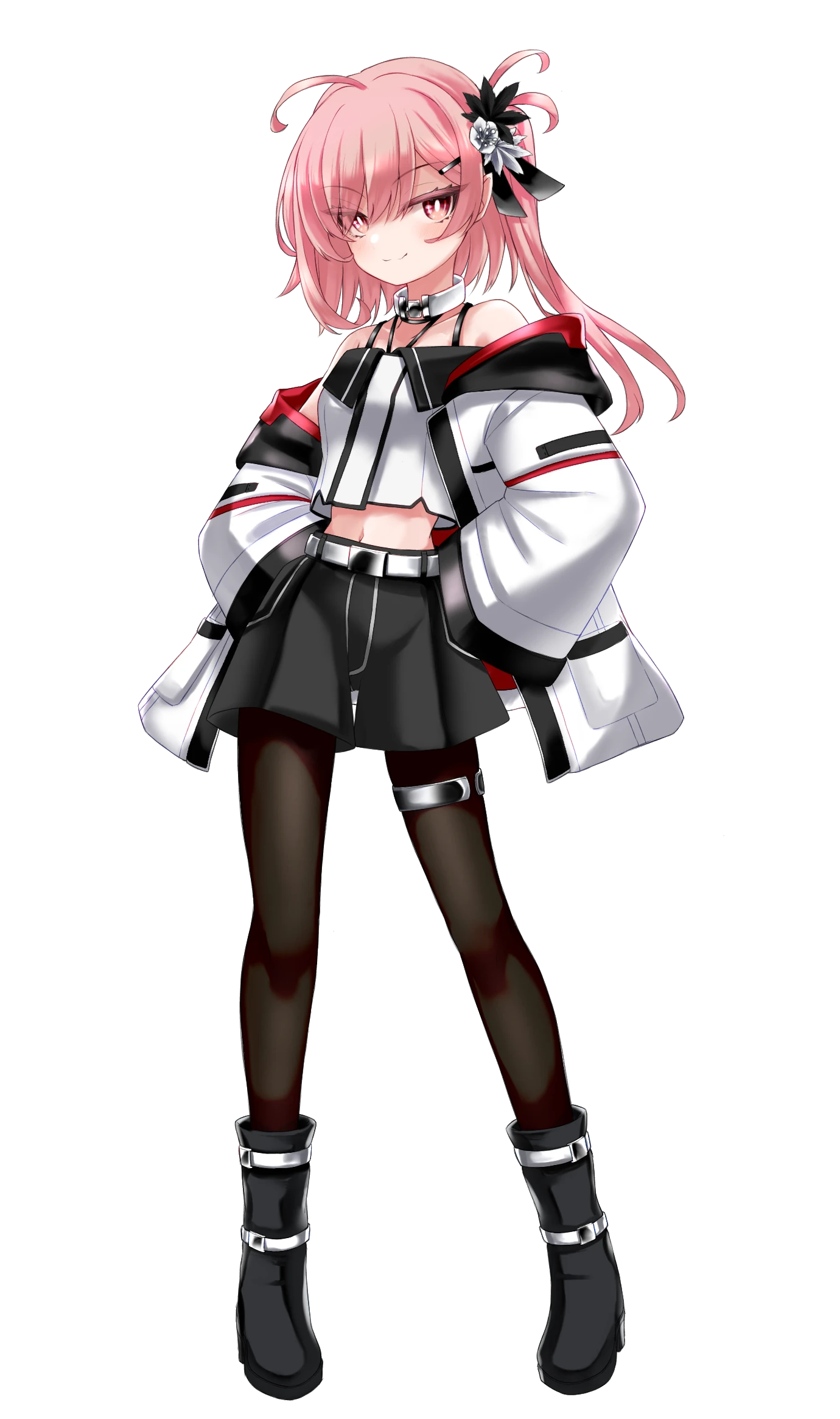 側頭部に結んだ薄紅色の髪と赤い瞳を持つ、明るげな表情が印象的な少女。
