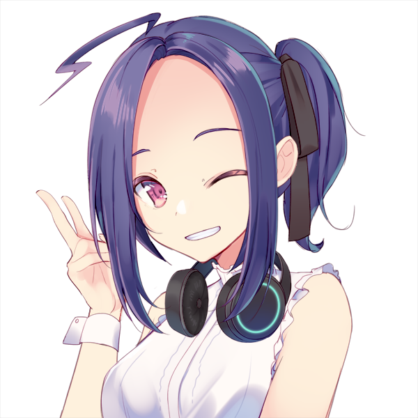 濃い藍色の長髪の女性。髪は後ろに一本にまとめている。