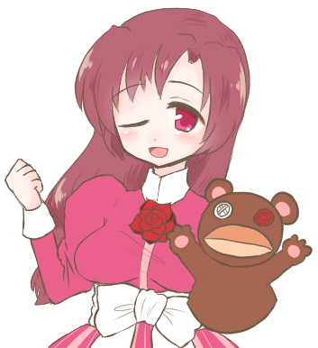 ローズピンクのワンピースに、薔薇のブローチ。手にはクマのパペット。