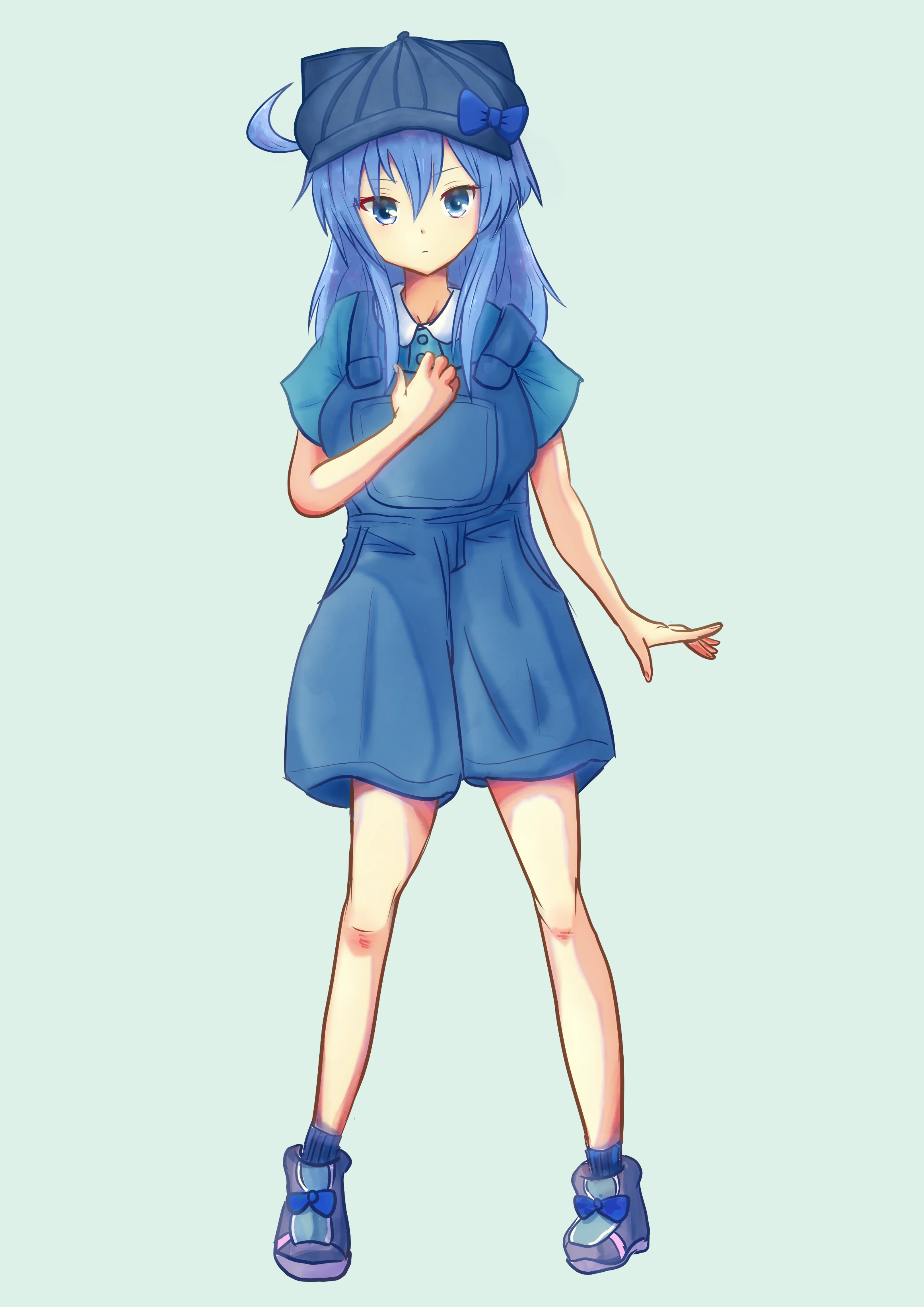 外見: 小柄で華奢。青みがかった髪に、瑠璃色に光る大きな瞳。猫耳っぽいシルエットのキャップに青いリボン。青緑のトップスに濃色のオーバーオール。お口ちっちゃい。仕草はどこか控えめ。