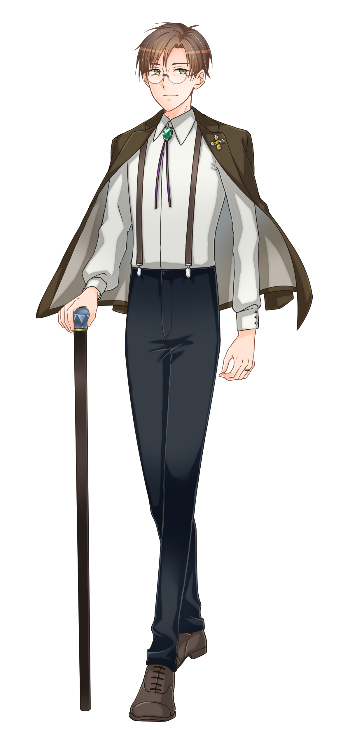 歩く際は右手に杖を携えているが高性能義足ではあるので、心配させないように持っているだけである。