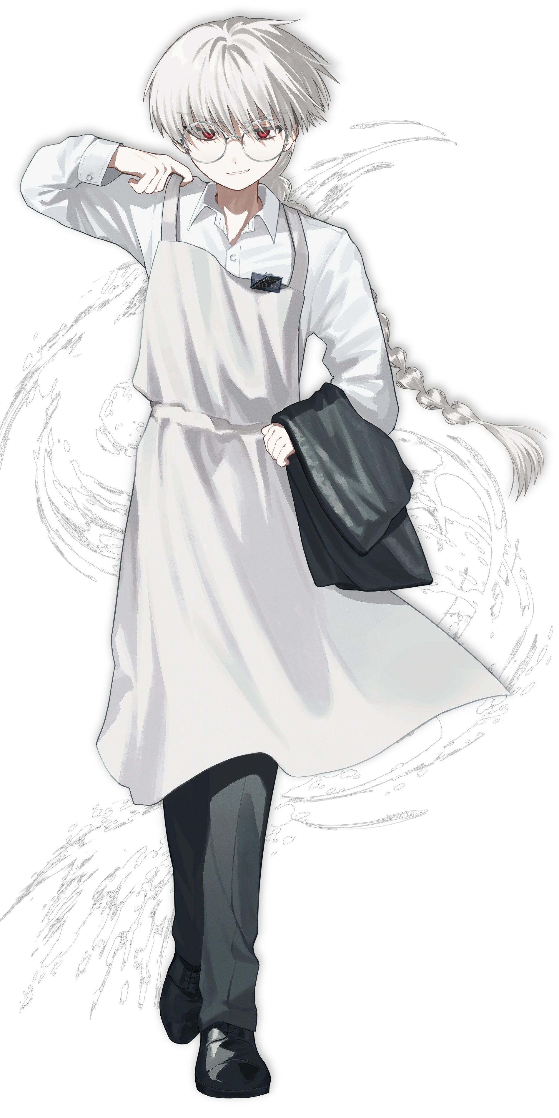 三つ編みに束ねた白い長髪、白いシャツに白いエプロンを身に纏った、全身真っ白スタイルの男性。