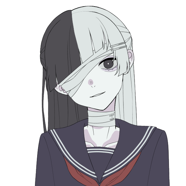 一見美しい少女の姿をしているが、肌は病的な程に白く、髪は中央から左右が白黒に分かれており、その顔は絶えず能面のような薄ら笑いを浮かべている。さらに、体のあちこちには包帯が巻かれており、大怪我を負っているかのようにも見える。話し方も非常に淡々としており、声の調子が変化する事は(PC1に関する事を除いて)殆ど無いため、感情を読み取るのは非常に難しい。エフェクトを使用したり感情が昂ったりすると、半液状の肉塊のような姿へと変貌するが、これは彼女の本当の姿であり、普段の姿の方がエフェクトを使用して作り出した姿である。