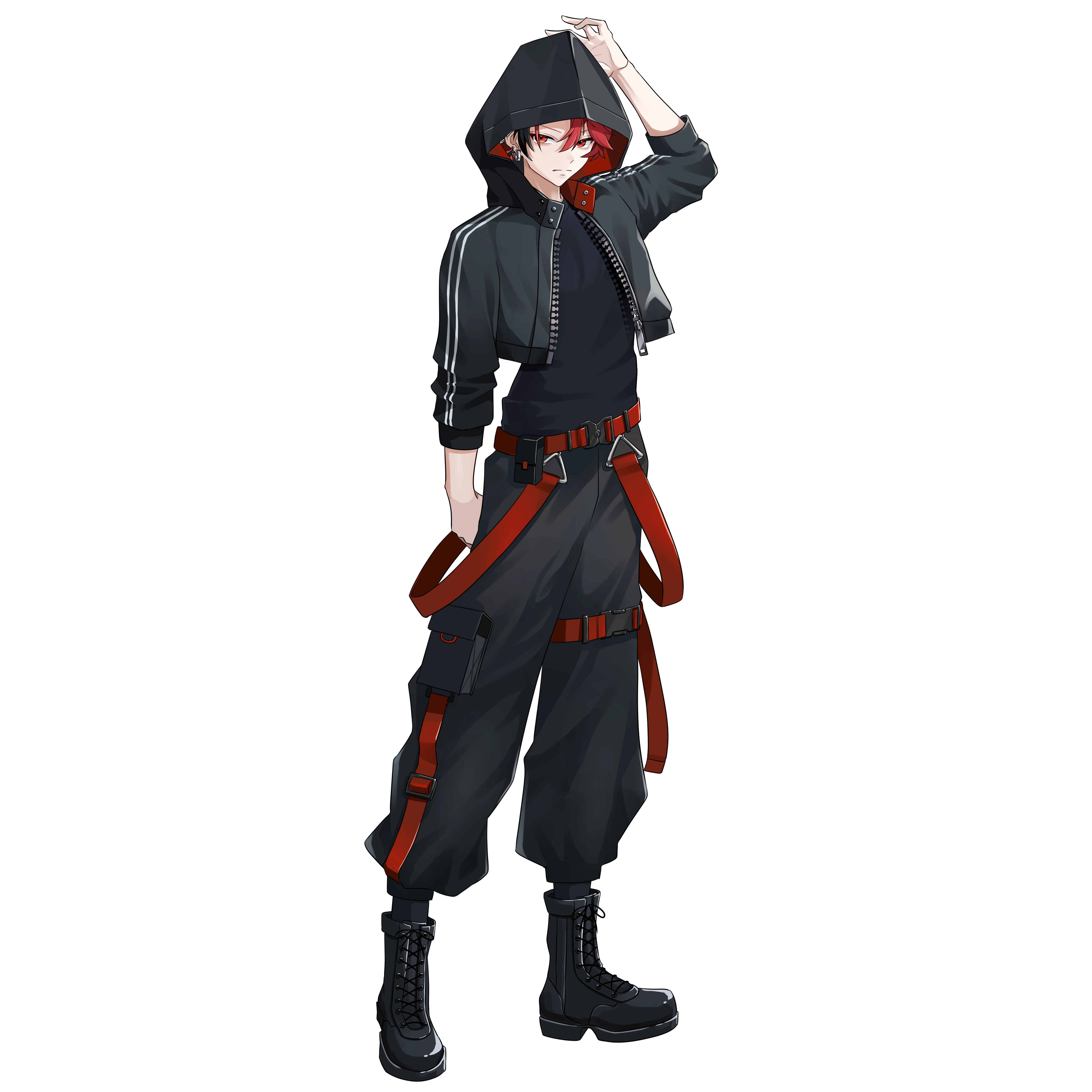 赤と黒のツートンカラーにフードを被った青年。