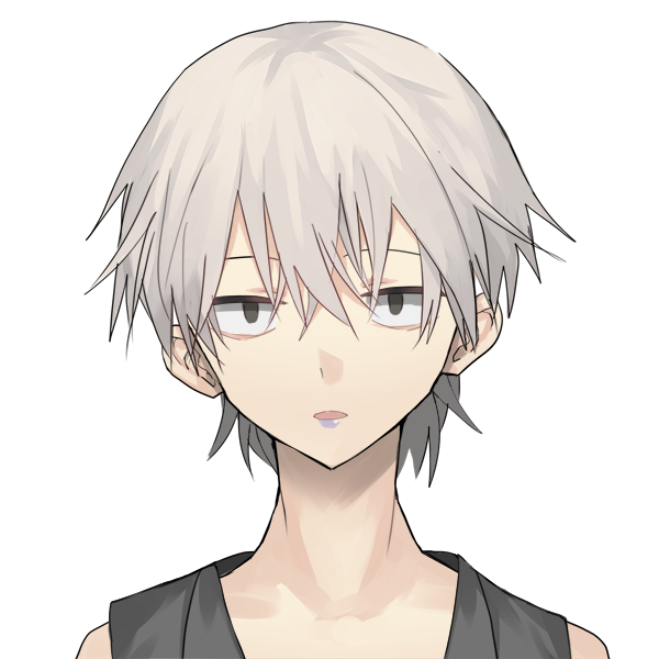 白髪、ダルそうな目つき、耐熱素材のタンクトップ姿