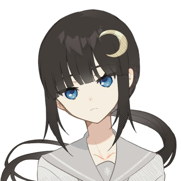 長い黒髪に青い目、月の髪飾り。