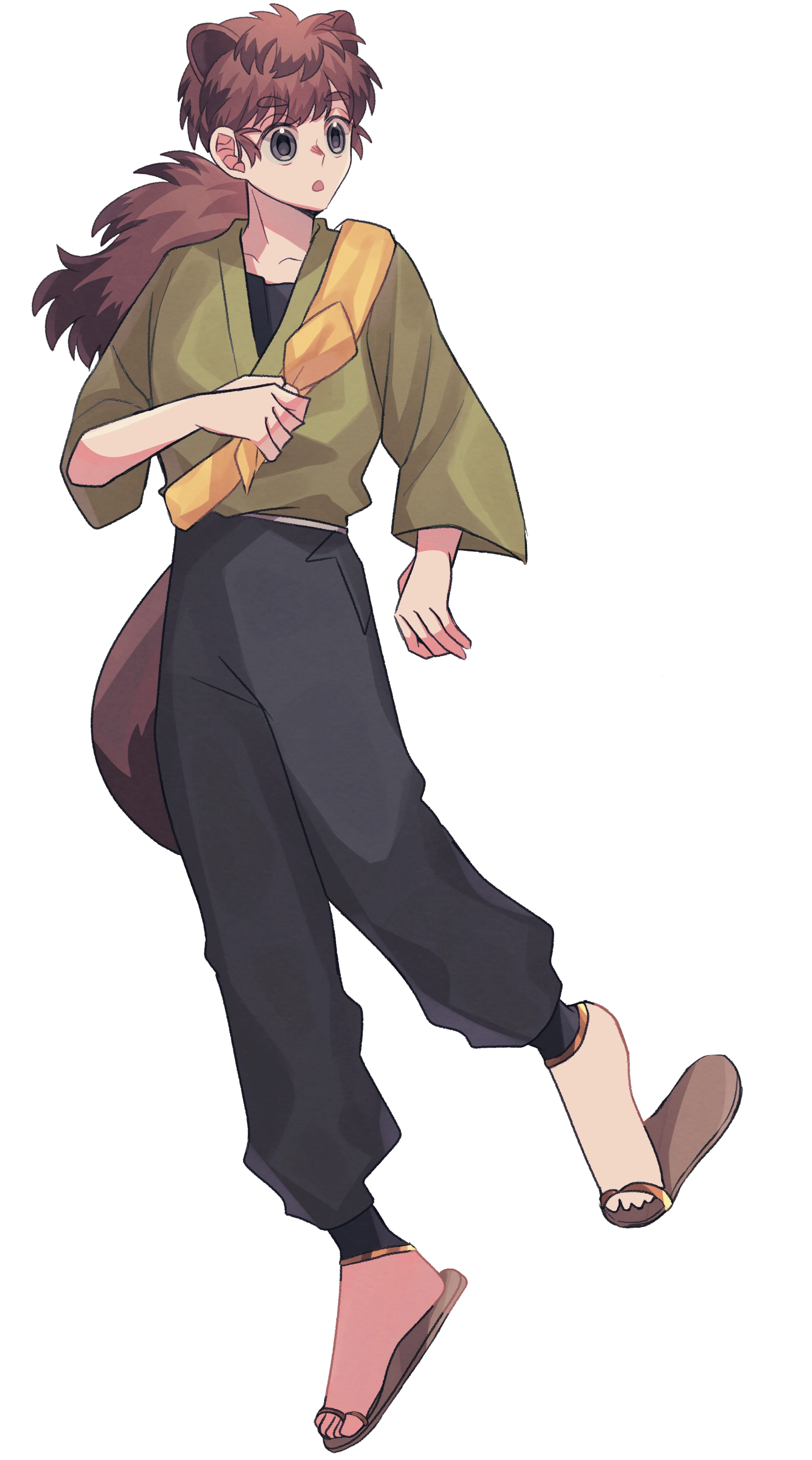髪:茶色と黒が混ざった髪を一つに下の方で結んでいる。その髪はぼさぼさで、たまに葉っぱが引っ付いている。