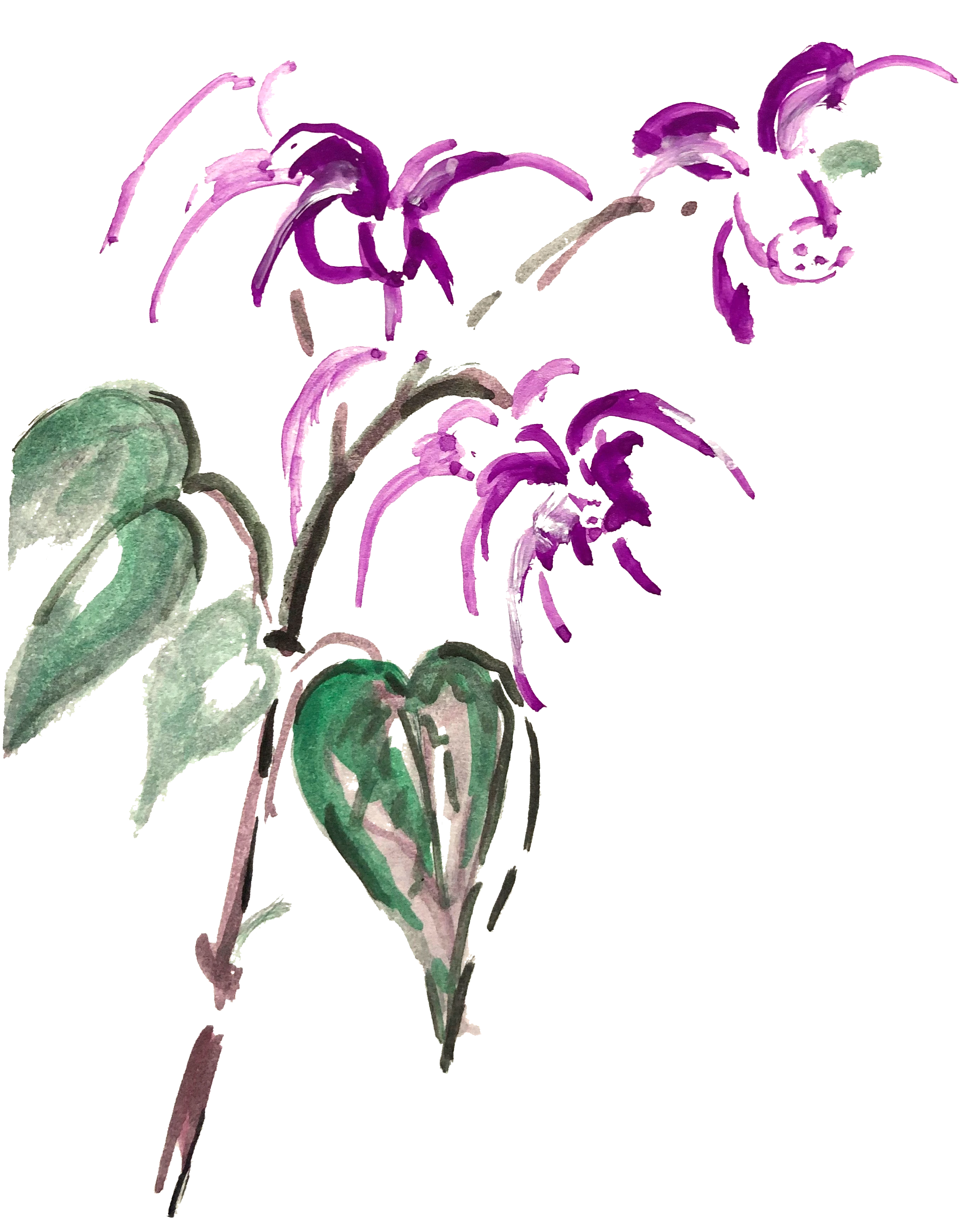 イカリソウのような紫の花、笠のような葉っぱ、そして触手のような根がある。
